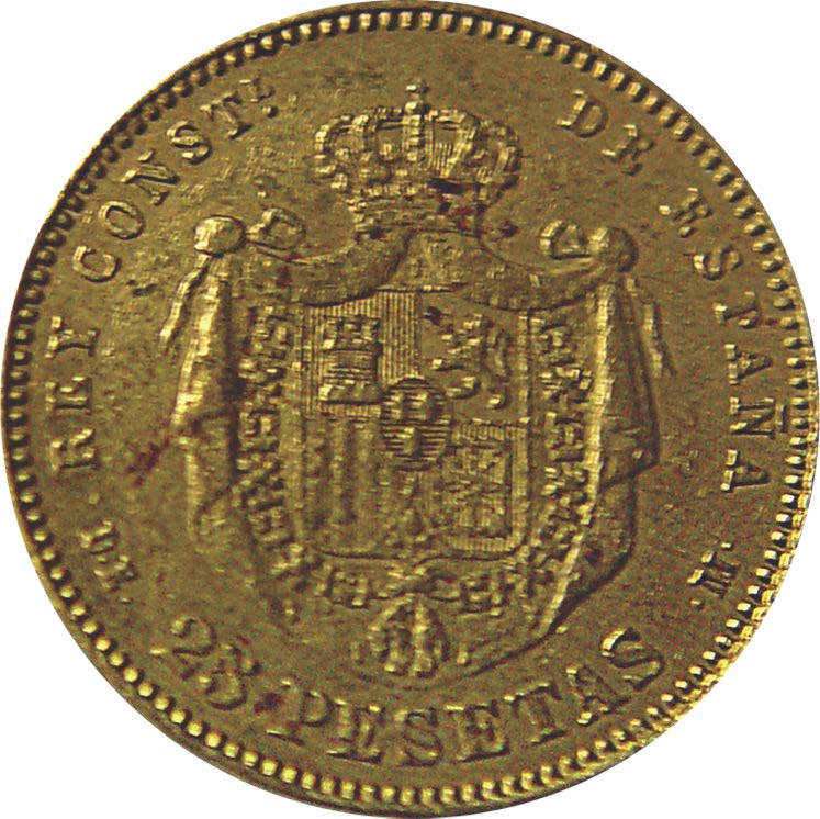 عملة ذهبية إسبانية فئة 23 بيزيتا – 1877 م