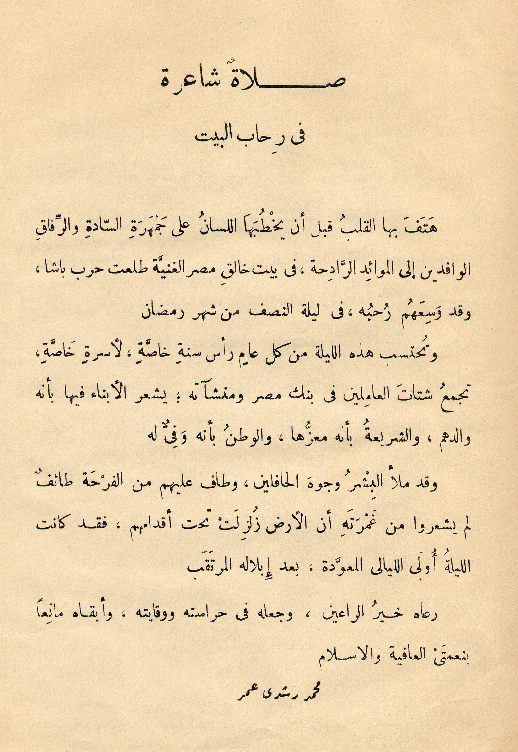كتاب من 7 صفحات يضم شعر كتبه محمد رشدي عمر عام 1938م بمناسبة النصف من رمضان، حيث كان يحرص طلعت حرب باشا على اعداد حفل في ليلة النصف من رمضان لجمع شتات العاملين في بنك مصر ومنشأته على مائدة الافطار