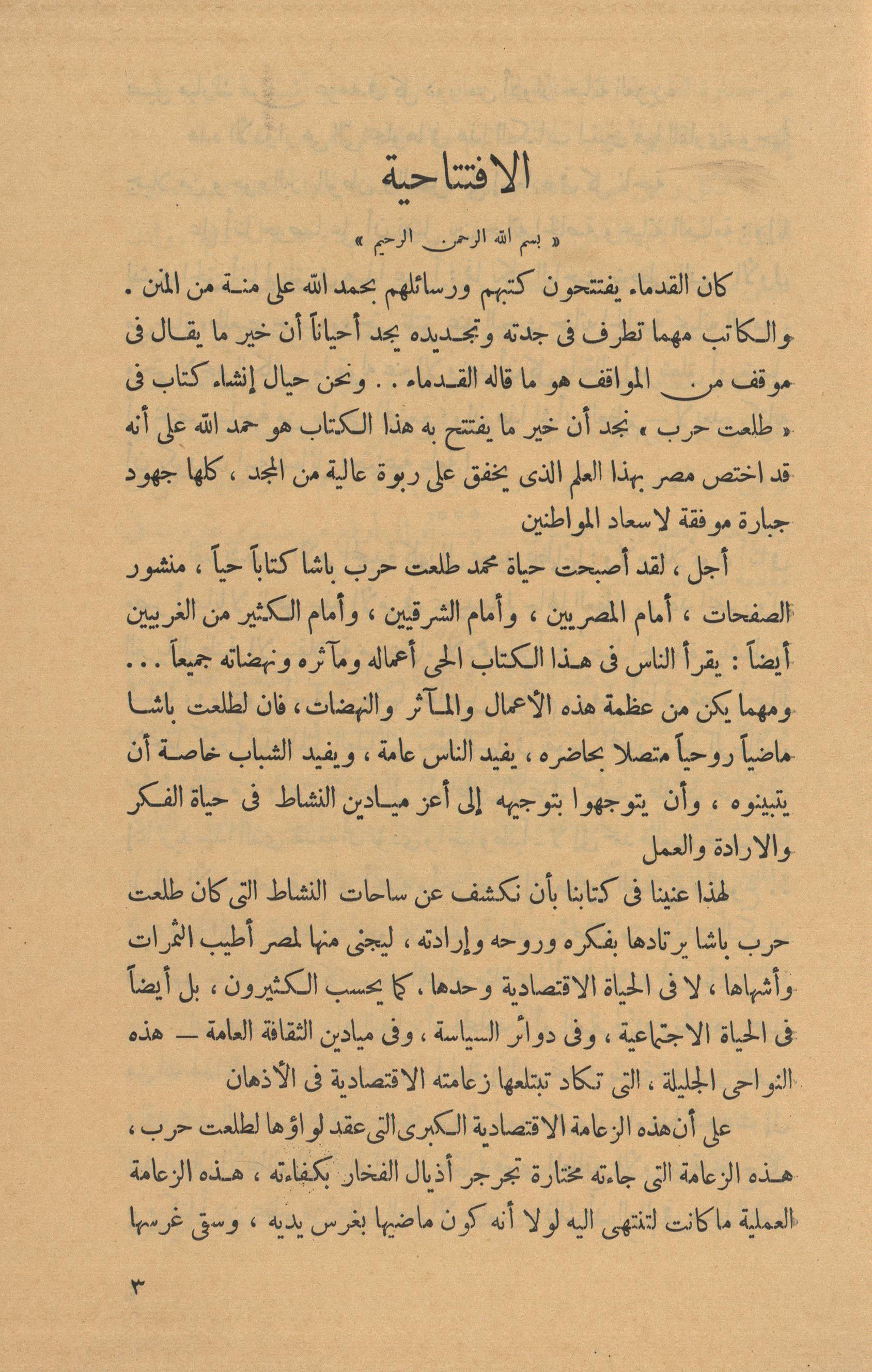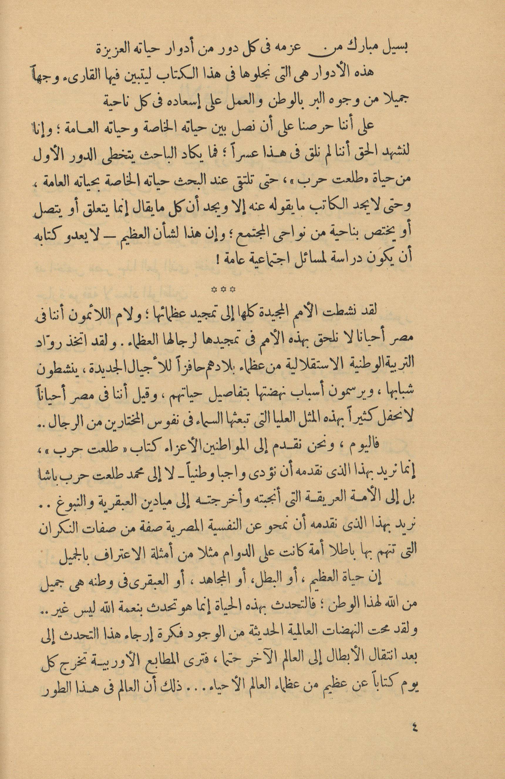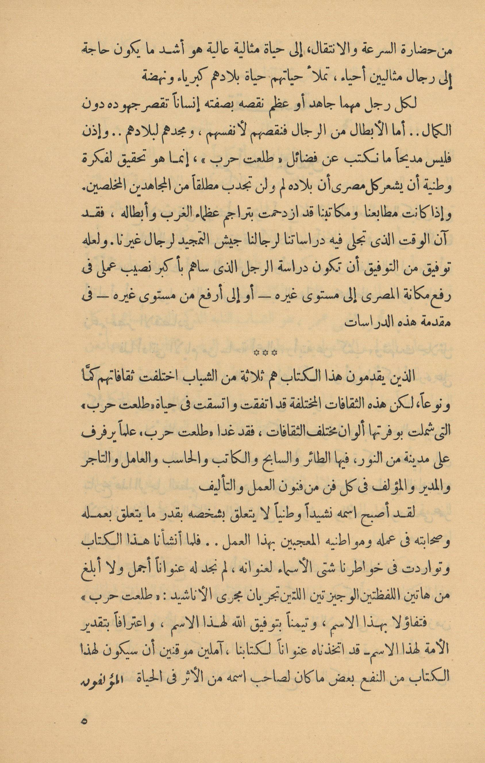 الكتاب يحتوي على خطب ومقالات ومحاضرات لطلعت حرب، مع لمحة من تاريخ حياته وأعماله بمناسبة الاحتفال الذي أقامته لجنة تخليد ذكرى محمد طلعت حرب باشا في قاعة الاحتفالات بجامعة القاهرة يوم الأربعاء الموافق 20 رجب 1376 هـ (20 فبراير 1957).