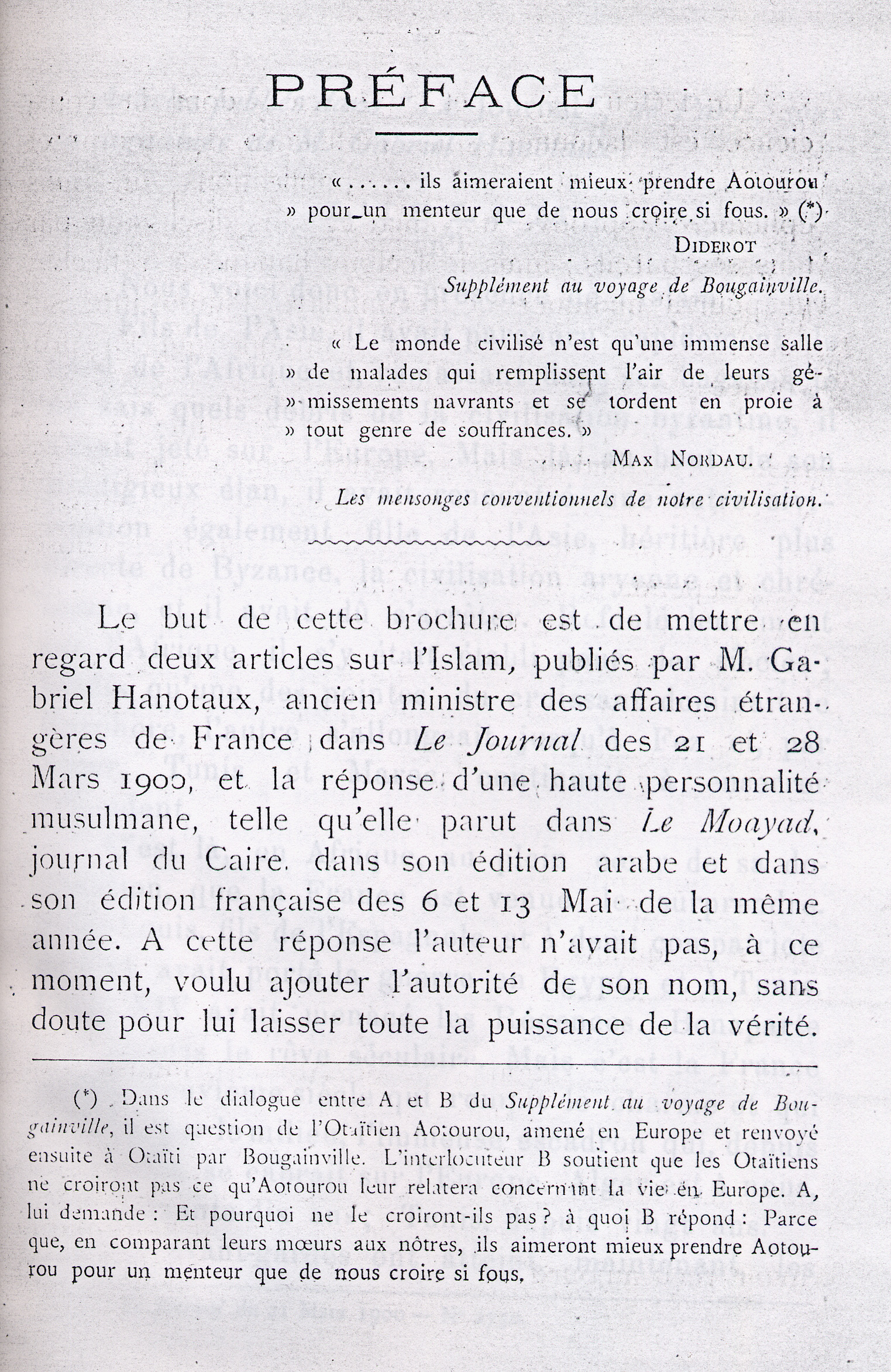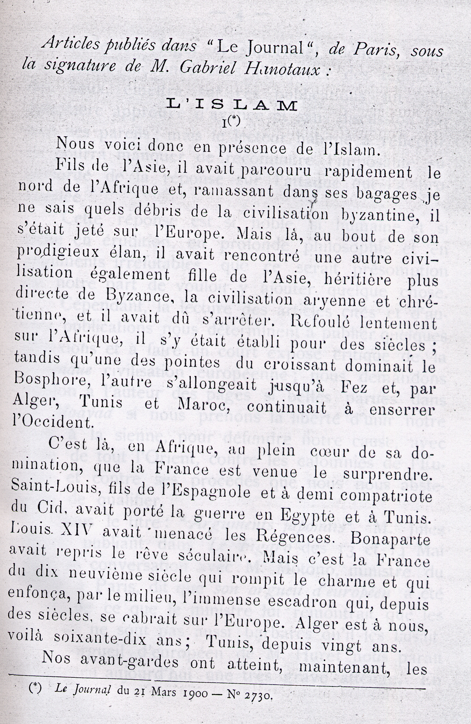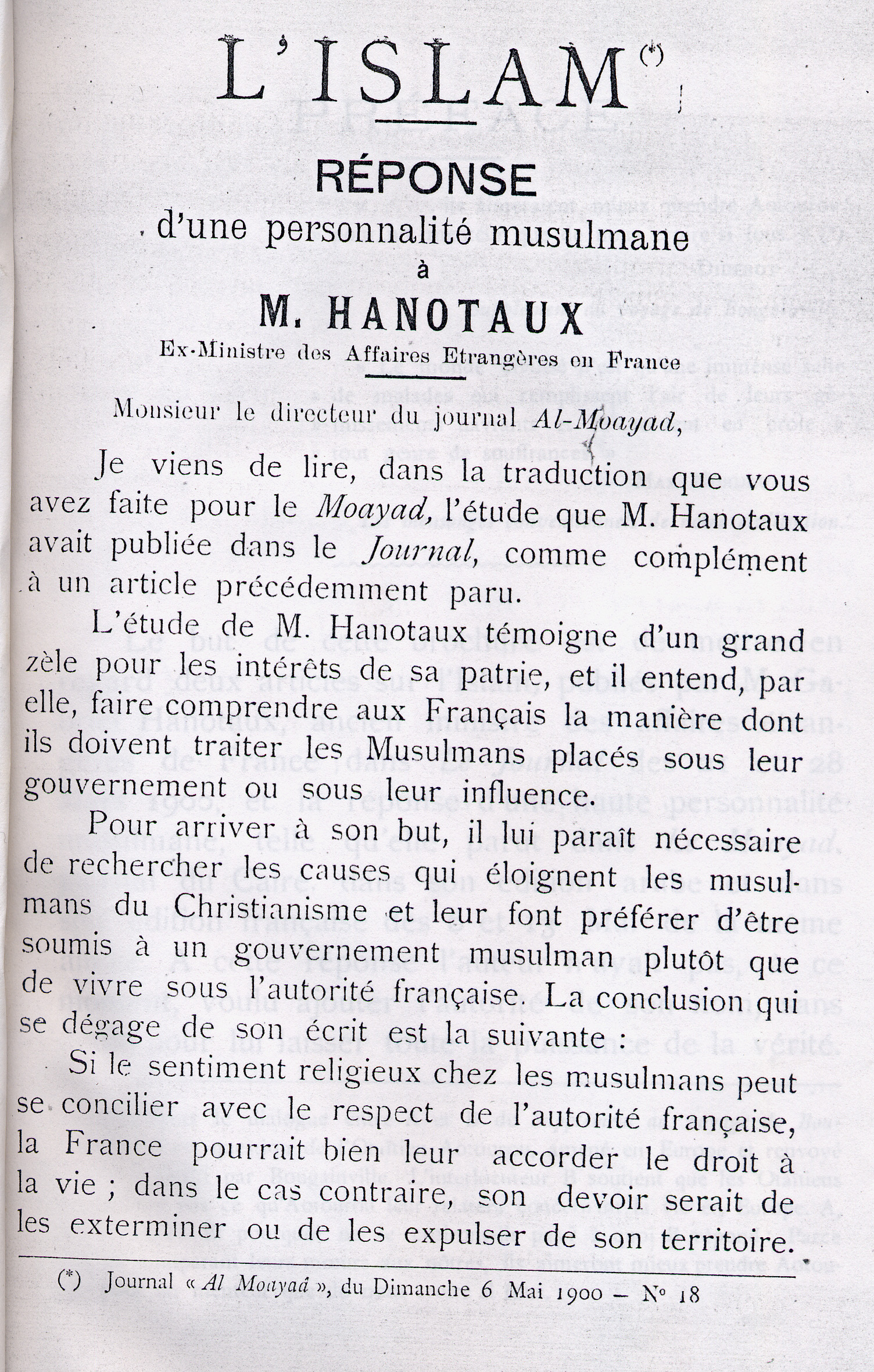 وهى مجموعة من المقالات كتبها الشيخ محمد عبده تحت عنوان "الإسلام والرد على منتقديه"، كان قد نشرها في "جريدة المؤيد" رداً على مقالات "هانوتو" وزير الخارجية الأسبق لفرنسا في ذلك الوقت والتي كانت منشورة في صحيفة "دو بارى".