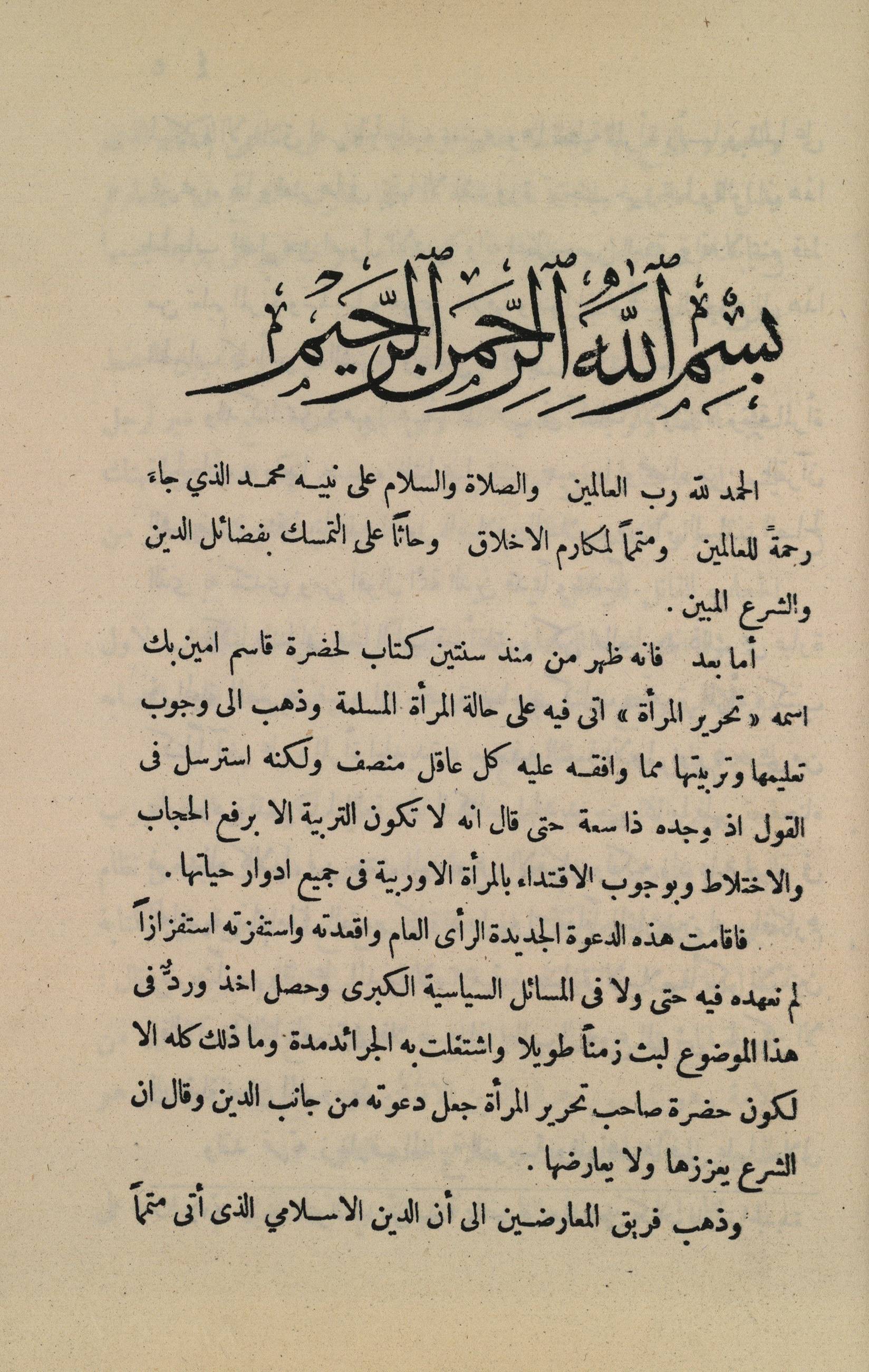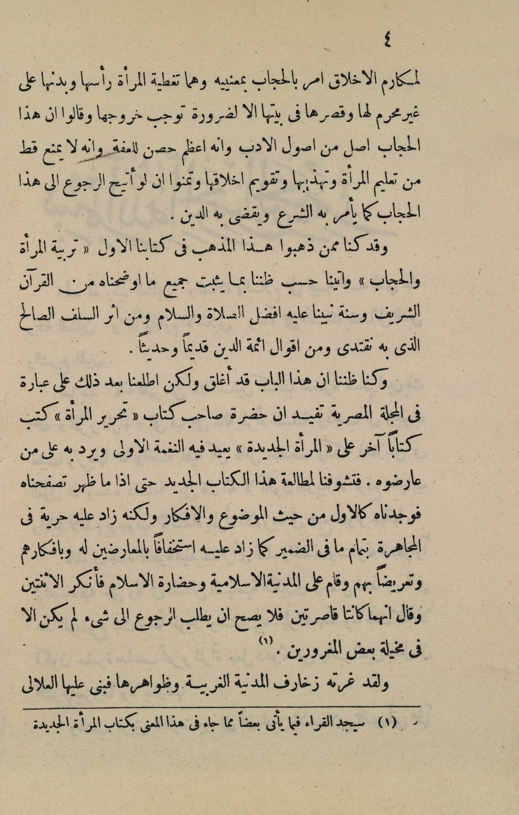 الكتاب هو رد من طلعت حرب باشا على كتاب قاسم أمين الثاني "المرأة الجديدة"، حيث تحدث قاسم أمين في كتابه الأول "تحرير المرأة" قائلاً إن التربية لا تكون إلا برفع الحجاب والاختلاط، وبوجوب الاقتداء بالمرأة الأوروبية في جميع أدوار حياتها. وزاد قاسم أمين على ذلك في كتابه الثاني "المرأة الجديدة" دعوته لحرية المجاهرة واستخفافه بالمعارضين له. فجاء رد طلعت حرب في هذا الكتاب ليدافع عن آداب المرأة المسلمة وحجابها، حيث إن حجاب النساء ليس فقط لأسباب دينية، بل هو من أصول الأدب والعفة للنساء.
